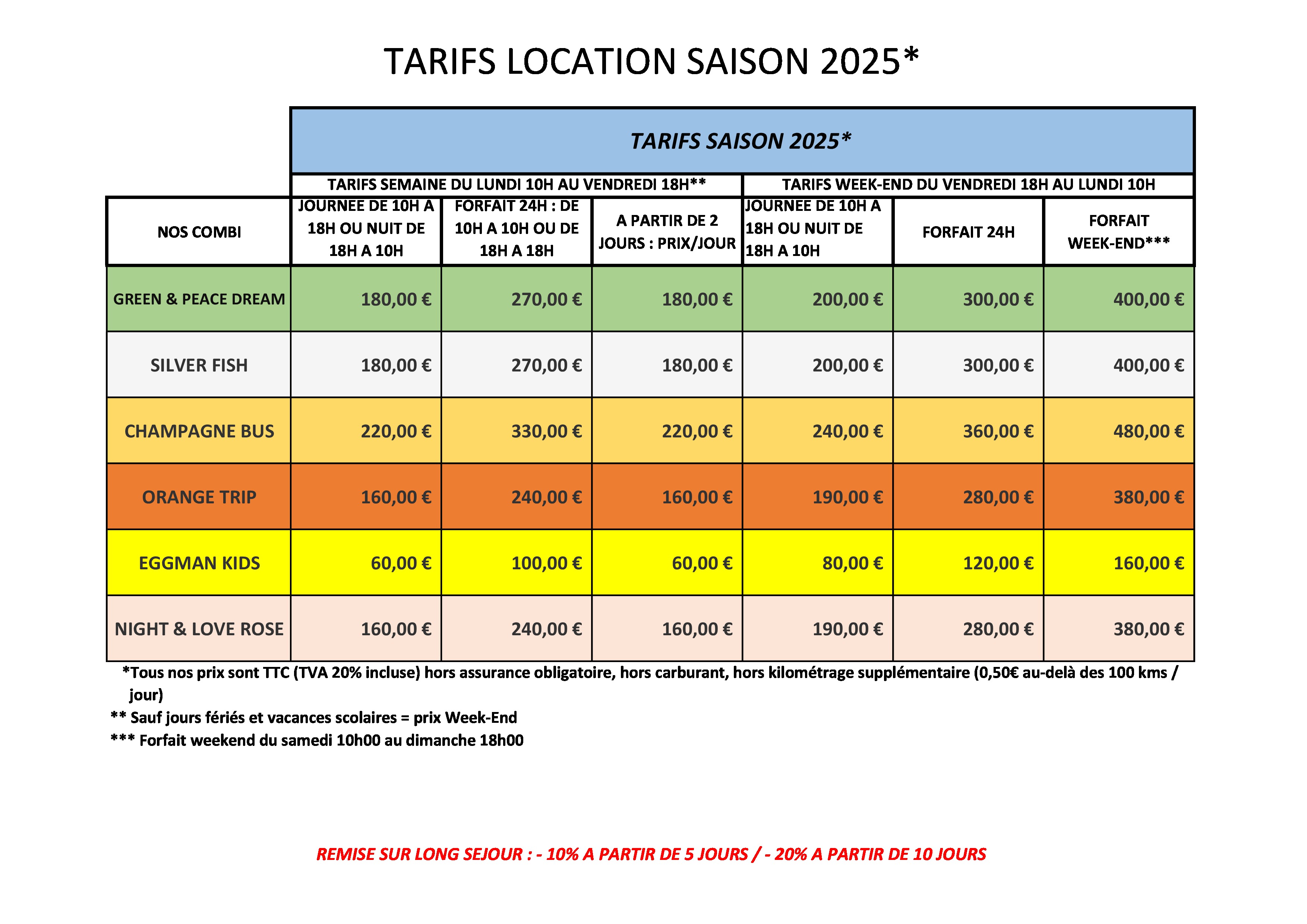 *Tous nos prix sont TTC (TVA 20% incluse) hors assure obligatoire, hors carburant, hors kilométrage supplémentaire (0,50€ au-delà des 100 kms / jour)